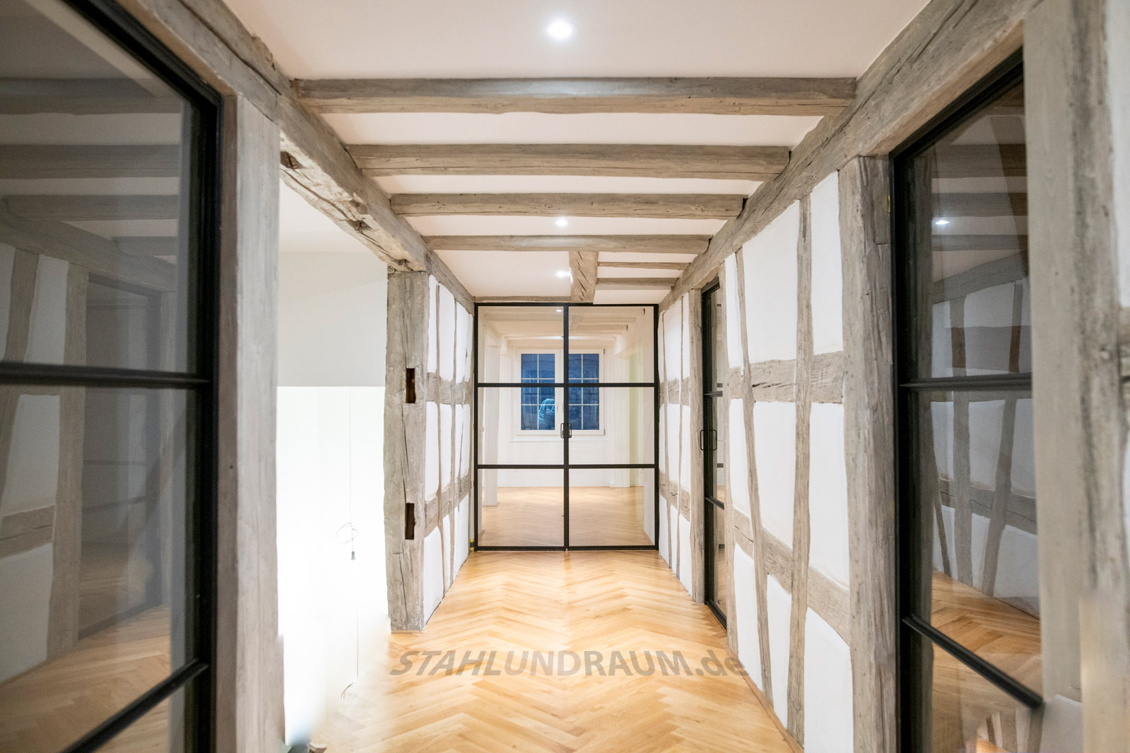 Dank der Verwendung von Winkelstahl- und T-Stahl-Profilen in Kombination mit Einscheiben-Sicherheitsglas entsteht eine edle Optik, die sich nahtlos in jedes Interieur einfügt.